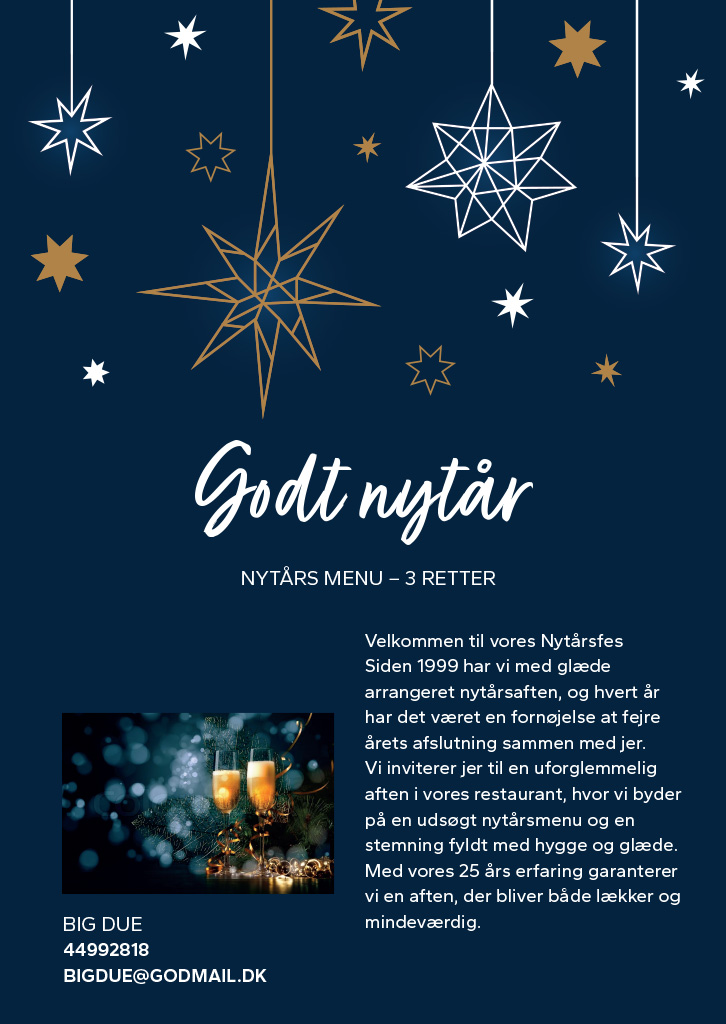 Velkommen til vores Nytårsfes Siden 1999 har vi med glæde arrangeret nytårsaften, og hvert år har det været en fornøjelse at fejre årets afslutning sammen med jer. Vi inviterer jer til en uforglemmelig aften i vores restaurant, hvor vi byder på en udsøgt nytårsmenu og en stemning fyldt med hygge og glæde. Med vores 25 års erfaring garanterer vi en aften, der bliver både lækker og mindeværdig.